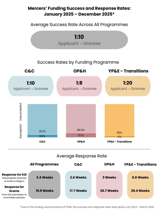 Across our programmes, the average success rate for funding applications is 1 in 10. The figures below provide further detail on our Success and Response Rates in 2025.